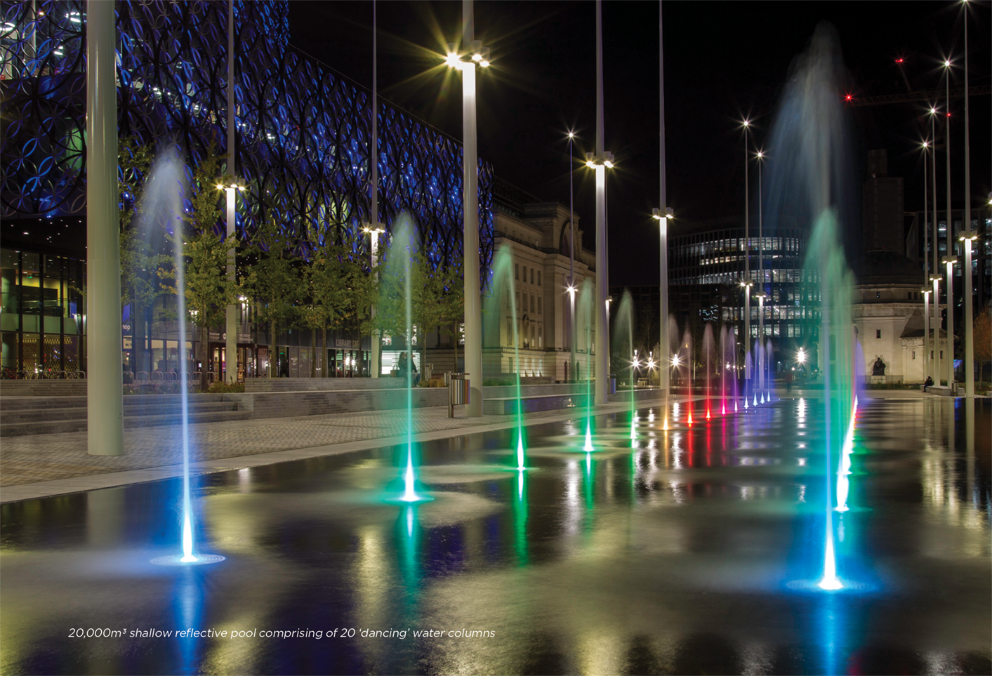 Surrounded by the Symphony Hall, Library of Birmingham and the Hall of Memory, the multi-million-pound redevelopment of Centenary Square Fountain now features a mesmerising 60m x 30m, 20,000m3 shallow reflective pool comprising of 20 ‘dancing’ water columns.