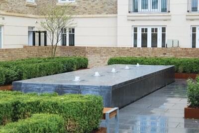 Surrounded by low-set hedges, the concrete water feature measures approximately 9m x 3m, with five column jets set along its length. Its tank holds 5m³ of water.