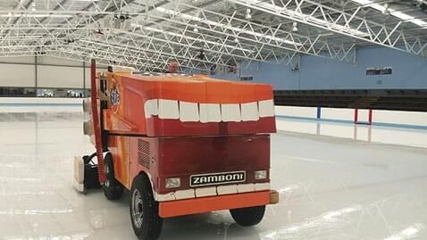 Preparing the ice surface for skating involves using a Zamboni ice re-surfacer. The machine works by shaving off the top layer of ice, which is then sucked up into the front of the machine into a bin. The machine then puts down a thin sheet of fresh water which freezes and forms a nice flat surface to skate on. The Zambonis can hold roughly two cubic metres of shaved ice (or “snow”) before they need to be emptied.