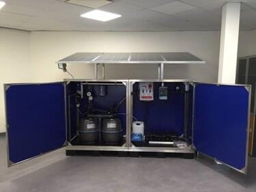 Each system Sotrad installed included a solar pump, a T400 filter with glass pearl media and T400 filter filled with activated carbon, a UV sterilizer, a hydraulic dosing pump to inject a residual amount of chlorine, a 4m3 water tank made of assembled fiberglass panels and a tap stand.