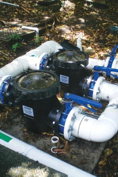 The filtration cycle starts in the pond where water runs through customised 8mm mesh baskets that catch large sticks and debris. Water then passes through the pump, which has a 220mm impellor, four-pole motor, 100mm inlet/outlet, and is operational at 1445rpm. Once large debris has been captured, water then flows through two manifold Waterco Hydro5000 commercial strainers, which each feature a 150mm inlet/outlet and 16-litre strainer baskets.