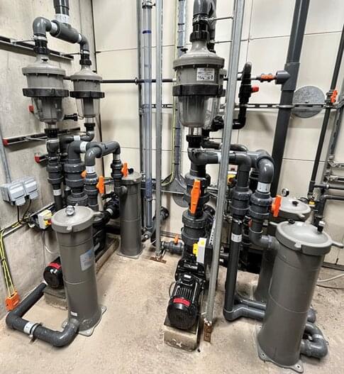 “The two Hydrostar pumps draw water from the main water feature and through two different systems,” explains Waterco Europe CEO Tony Fisher. “Each consists of two C75 bag filters and double manifold MultiCyclone centrifugal filtration units before entering Waterco’s Micron SMDD900 commercial media filters and re-entering the feature via the main reservoir. The primary sanitisation is chlorine and acid with UV installed as a secondary system.”