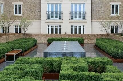 Surrounded by low-set hedges, the concrete water feature measures approximately 9m x 3m, with five column jets set along its length. Its tank holds 5m³ of water.