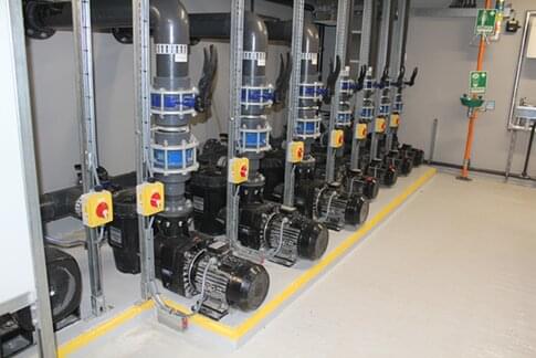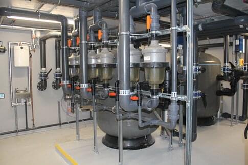 The plantroom for the children’s play pool and the cascading waterfall comprising of Micron filters, EcoPure Glass media, multicyclones and the Hydrostorm Pumps.