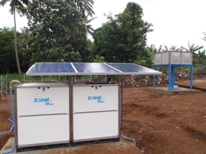 Each system Sotrad installed included a solar pump, a T400 filter with glass pearl media and T400 filter filled with activated carbon, a UV sterilizer, a hydraulic dosing pump to inject a residual amount of chlorine, a 4m3 water tank made of assembled fiberglass panels and a tap stand.
